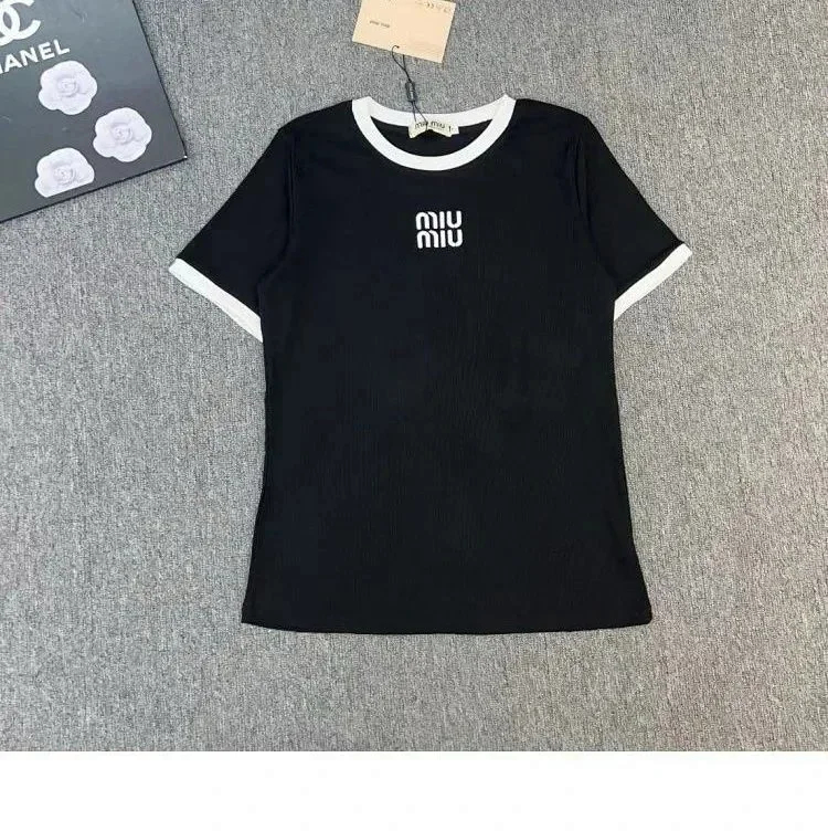 Home > MIUMIU 2025 New Round Neck Contrast Color Letter Print Loose Short Sleeve T-shirt-2583